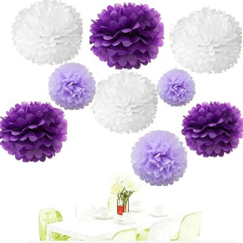 Since®18Pcs of 8" 10" 14" 3 Colors Mixed White Purple and Lavender Tissue Paper Flowers,Tissue Paper Pom Poms,Wedding Party Decor,Pom Pom Flowers,Tissue Paper Flowers Kit,Pom Poms Craft,Pom Poms Decor