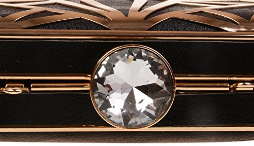 This compact clutch bag features hollow metal frame construction and a sparkling rhinestone closure on the top.