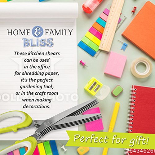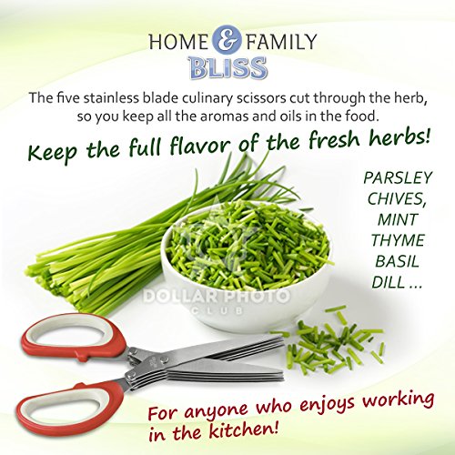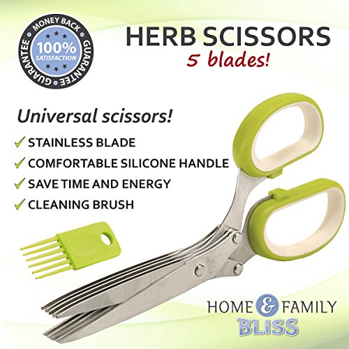 - Feature : Cuts herbs 5 times faster and with no crushing or mincing: keep the full flavor of the fresh herbs. The five stainless blade culinary scissors cut through the herb, so you keep all the aromas and oils in the food. / Versatile and comfortable silicone handle: the soft handle makes these scissors must have equipment for anyone who enjoys working in the kitchen. Use them for parsley, chives, basil, dill, mint, thyme and many more, and use them as a part of your daily healthy food diet. / Easy to use: no more mess in the kitchen. Cut herbs directly into the pot - save time and energy when cooking delicious food. / Perfect gift: give these 5-blade scissors to the chef or gardening fanatic for birtdays, weddings, christmas. These kitchen shears can be used in the office for shredding paper, it's the perfect gardening tool, or in the craft room when making decorations. / Cleaning brush included: easy to keep your herb shears clean at all times. Dishwasher safe and 100% money back satisfaction guaranteed.