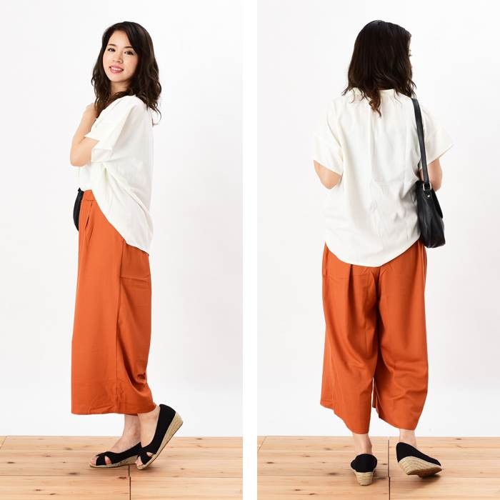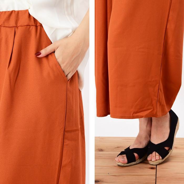 ●商品の特徴・着心地が軽く、ざらっとした細かな凹凸のような生地感のジョーゼット生地のガウチョパンツです。・無地でシンプルな雰囲気があるので、幅広いコーディネートに取り入れやすく着回しやすいデザインです♪・カジュアルにもフォーマルにも着まわせるので、様々なコーディネートに取り入れやすく幅広い年齢層の方に大人気です♪・ゆったりとしたシルエットなので、着心地楽ちんです。●サイズ展開 【M】 着丈80cm ウエスト64~70cm 【L】 着丈81cm ウエスト69~77cm●カラー展開 ダークオレンジ カーキ モカ ネイビー ※画像をご参照下さい。●商品詳細 【素材】:ポリエステル100% 【厚み】:普通 【裏地】:なし 【シルエット】:ゆったり 【伸縮性】:なし 【付属品】:なし (コーディネート使用の衣類、アクセサリー等は付属しません)20代 30代 40代 50代 人気 レディースファッション 大きいサイズ