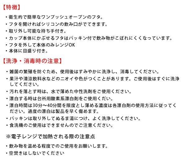 | 仕様 | 容量:230ml 耐熱温度:上下フタ・持ち手・プッシュボタン100度、本体140度、ストロー・パッキン・吸い口140度 対象年齢:8ヶ月~ 食洗機:不可 電子レンジ:本体のみ可(※飲み物を温める程度、空焚きはしないでください。) |