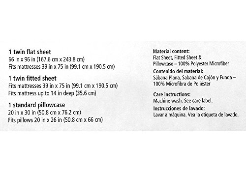 - Dimensions: Flat Sheet: 66x96 inches, Fitted Sheet: 39x75 inches (Fits Mattress up to 14 inches deep) and 1 Standard Pillowcase: 20x30 inches (Fits Pillowcase 20x26 inches).