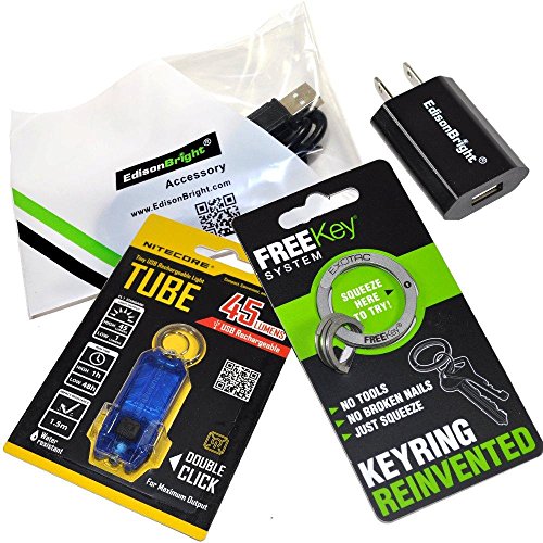 NITECORE TUBE (BLUE) 45 LUMEN USB RECHARGEABLE KEYCHAIN LIGHT, EXOTAC FREEKEY SYSTEM, EDISONBRIGHT USB CHARGER AND EDISONBRIGHT USB CABLE