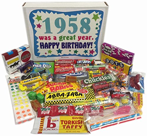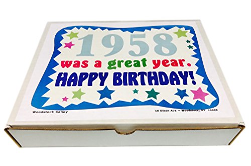 -. Binding : Misc. -. Brand : Woodstock Candy -. Feature : Makes a fun and unique gift for a 59th birthday celebration / Perfect for the person who has everything / Everyone loves candy from their childhood! / Box reads "1958 was a great year. Happy Birthday!" / Comes shrink wrapped in a box that measures 11.75" x 9" x 2" -. IsAdultProduct : 0 -. Label : Woodstock Candy -. Manufacturer : Woodstock Candy -. PackageQuantity : 1 -. ProductGroup : Grocery -. ProductTypeName : GROCERY -. Publisher : Woodstock Candy -. Studio : Woodstock Candy -. Title : 59th Birthday Gift Box of Nostalgic Retro Candy from Childhood for a 59 Year Old Man or Woman Born in 1958