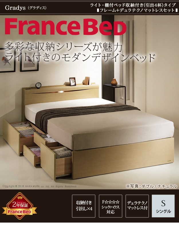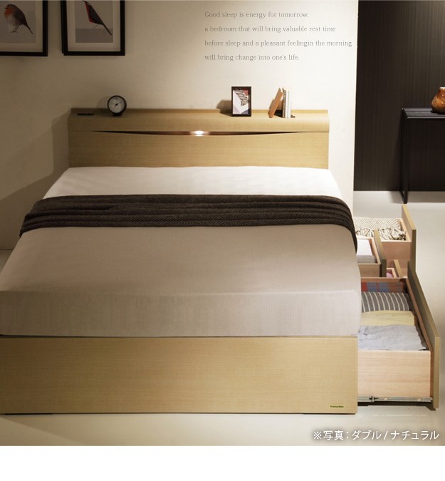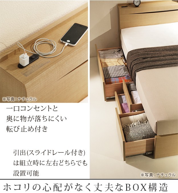 【!ご注文前に必ずご確認下さい!】●メーカー直送のため代金引換はお受けできません。●沖縄・一部離島は別途送料がかかります。お見積りいたしますのでお問い合わせ下さい。●商品サイズと設置場所、搬入経路のご確認をお願いいたします。●受注生産品のため、発注後のキャンセル及び変更はお受けできませんのでご了承ください。●メーカー2年保証【セット構成】ベッドx1・マットレスx1【カラー】ダークブラウン・ミディアムブラウン・ナチュラル【仕様】■ベッド本体:プリント紙化粧合板床板:布張り引出し:スライドレールコンセント:1口1500Wコード長さ:約1.7m照明:LED0.2W◎組立品■マットレス張地:ポリエステル50%、ポリプロピレン50%中身:ウレタンフォーム、パームパッド、ポリエステル綿、防虫不織布、羊毛コイル:デュラテクノスプリング【サイズ】■ベッド外寸:幅98x奥行211x高さ87cm/約60kg床面高さ:33cm床面サイズ:幅98x奥行195cm宮上有効サイズ:幅97.5x奥行12cm■マットレス外寸:幅97x奥行195x高さ23cm/約20kg株式会社ナカムラ(I-4700330)