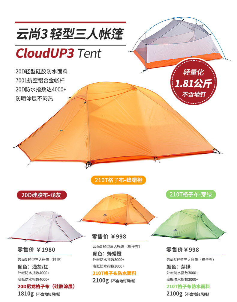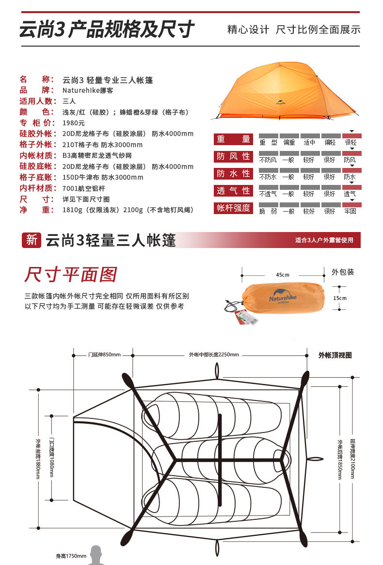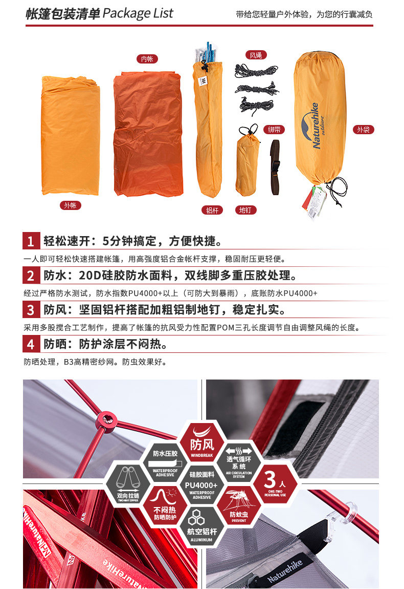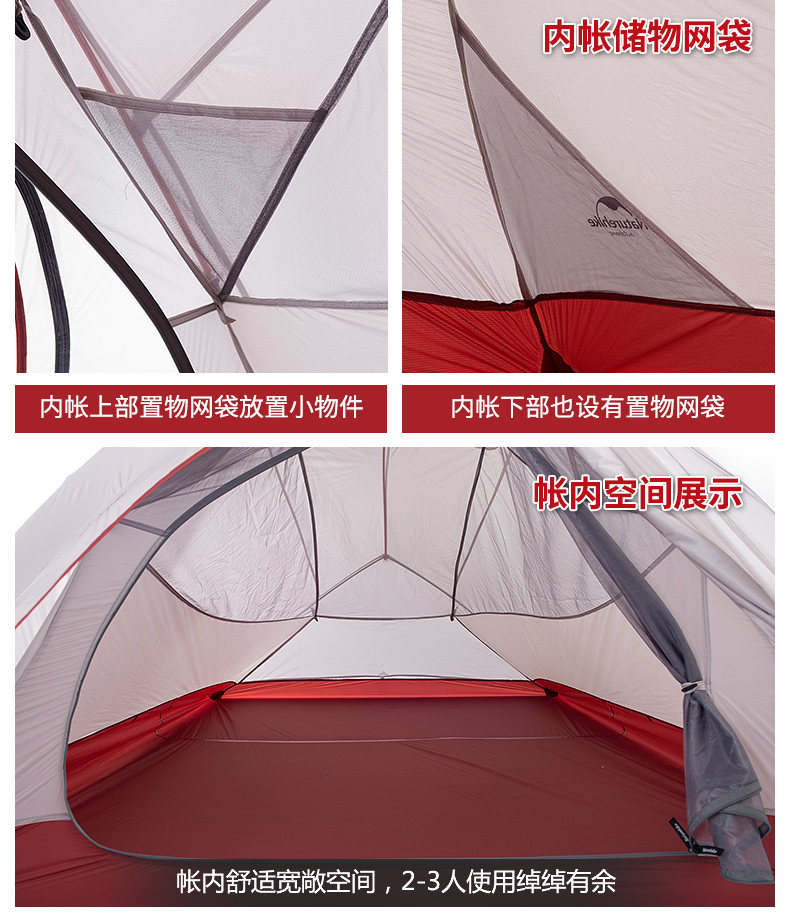 󰄬NH云尚超轻3人帐篷户外三人防雨登山四季野外露营双层防暴雨