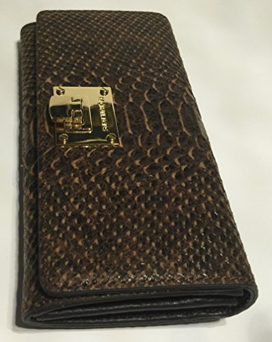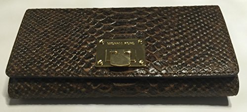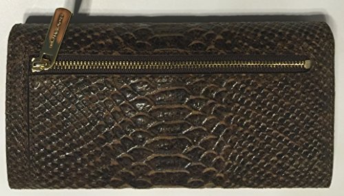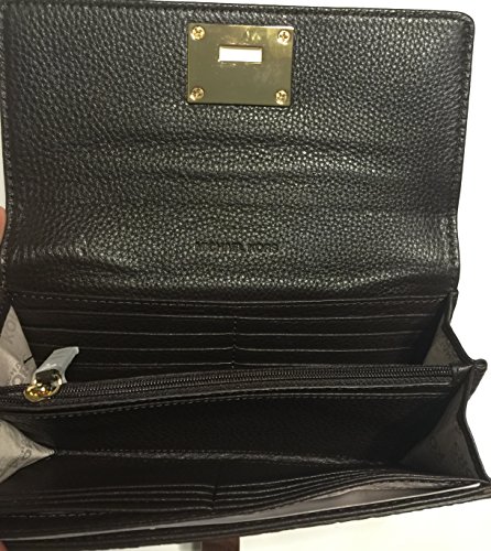 Wrapped in beautiful leather and polished gold tone hardware. This flap style carryall features a push lock closure with Michael Kors engraved logo, and a zippered pocket on the back. The black pebbled leather and MK monogram fabric interior features (16) credit card slots, a center zippered coin compartment and multiple bill slots. It measures approximately 8 inches (L) x 4 inches (H) x 1.5 inches (H). Comes in a beautiful Gift BoxFeature