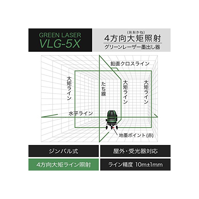 원본상품명:VOICE 5ライン グリンレザ墨出し器 VLG-5X メカ1年保 4方向大矩照射モデル【受光器セット】