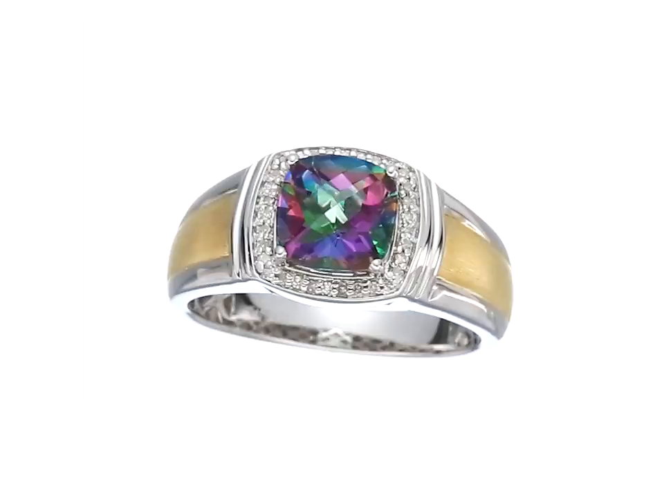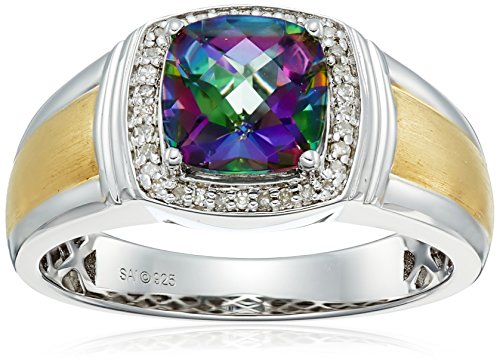 Men's Sterling Silver with Yellow Gold Plating Mystic Fire Topaz and Diamond (0.1cttw, I-J Color, I2-I3 Clarity) Cushion Ring, Size 10.5