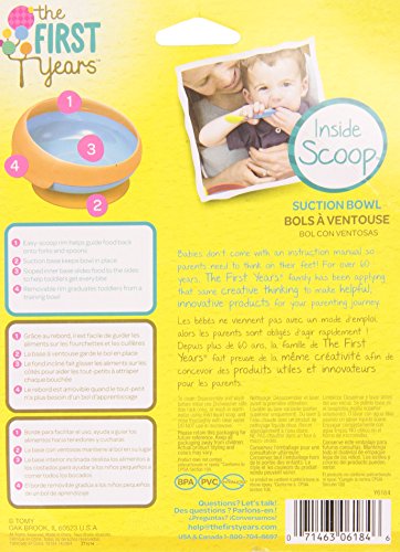 -. Binding : Baby Product -. Brand : The First Years -. Label : The First Years -. Manufacturer : The First Years -. PackageQuantity : 1 -. ProductGroup : Baby Product -. ProductTypeName : BABY_PRODUCT -. Publisher : The First Years -. Studio : The First Years -. Title : The First Years The First Years Inside Scoop Suction Bowl
