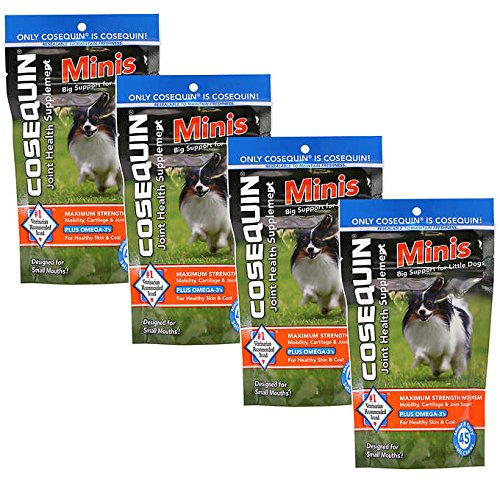 -. Binding : Misc. -. Brand : Cosequin -. EAN : 0723781704737 -. Feature : A petite bite for your pampered pet / Veterinarian recommended retail joint health supplement brand / Specially formulated and designed for dogs under 25 lbs. / Tasty formula Designed for smaller mouths / Cosequin brand joint health supplement is shown to be safe effective and bioavailable in peer-reviewed published controlled U.S. veterinary studies. -. Label : Cosequin -. Manufacturer : Cosequin -. PackageQuantity : 1 -. ProductGroup : Pet Products -. ProductTypeName : PET_SUPPLIES -. Publisher : Cosequin -. Studio : Cosequin -. Title : Cosequin Minis Maximum Strength with MSM Plus Omega-3's for Dogs 4-Pack -. UPC : 723781704737