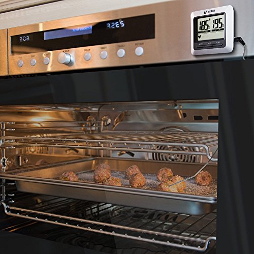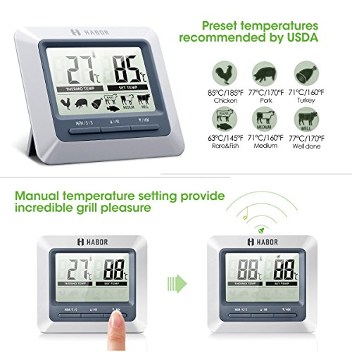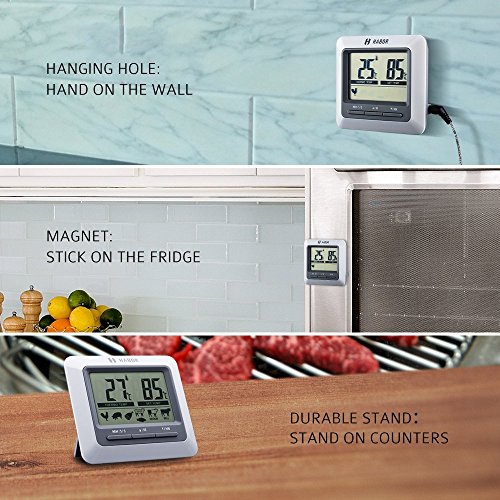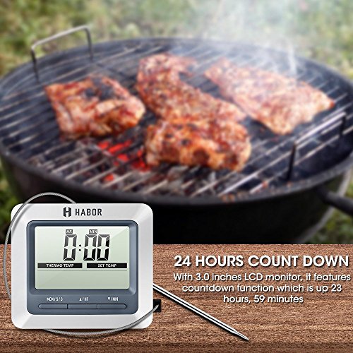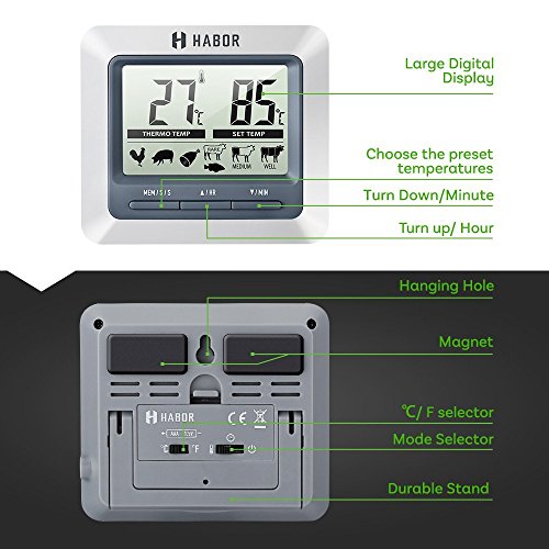 Get Your Grill On Knowing exactly when to take your meat off the grill has never been easier. Just insert the Habor meat thermometer probe into the meat you'd like to track, and set up the exact degree of the meat, the digital cooking thermometer will alert you when the meat is done. Savor Perfection It has never been easier to cook food like that, just enjoy your perfect barbecue experience. Your friends and family will be surprised how you fired up such a delicious meal without getting stuck by the grill. Convenient Place Featuring a compact design, this habor cooking meat thermometer has a durable clip and a magnet on the back, allowing you to attach it to metal surfaces or can be stood up on counters. Plus, with a hanging hole, you can hang it on the wall. Easy Operation Operating on 1*AAA battery which can easily be replaced, this classic digital meat thermometer will help you to keep track of your food when grilling! Replace battery when the screen becomes unclear or the ring volume becomes small. Battery (included): 1 X AAA , 1.5 V Warranty Every Habor cooking meat thermometer includes a 45 days money back 18-month worry-free guarantee! 0