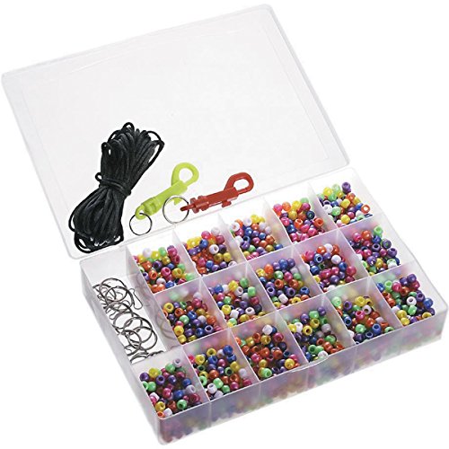 Organizer kits include over 2,000 9mm pony beads, 50 patterns, 12 yards of cord, 12 lanyard hooks, 12 key rings, 2 plastic clips to hook critters on book bags, belt loops, and more.