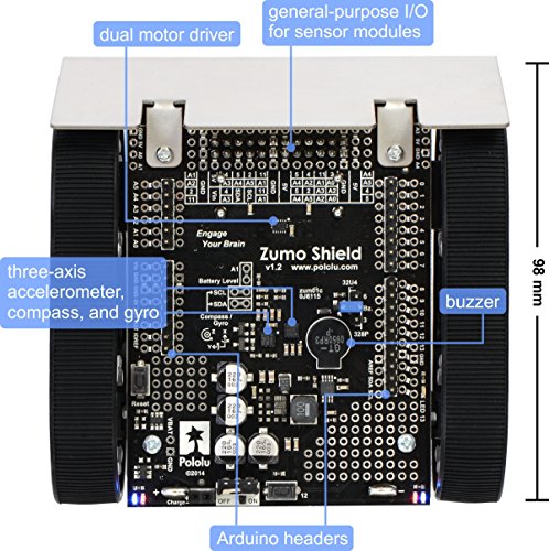 Integrated 75:1 HP micro metal gearmotors that offer a good blend of speed (up to 2 feet per second), power, and control. Mounted array of six IR reflectance sensors that allows the Zumo to detect contrasts in reflectivity directly beneath its blade, which can be used for following lines or detecting edges (e.g. the white outer area of a sumo ring or the edge of a table). Integrated DRV8835 dual motor drivers capable of delivering enough current for the Zumo's two high-power gearmotors. Piezo buzzer for playing simple sounds and music. The buzzer is controlled by one of the Arduino's PWM outputs, so tones can be generated in the background without taking up a lot of processing power.Feature
