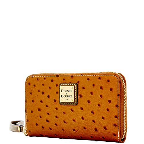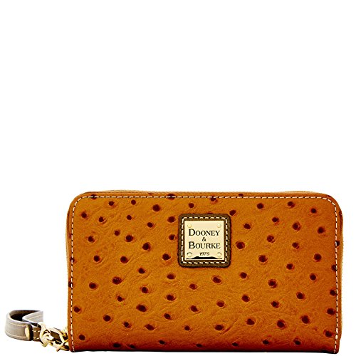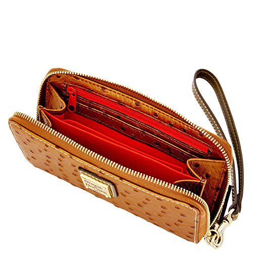 Product Description Dooney Bourke Ostrich Embossed Leather zip wallet Wristlet Clutch Bronze / Grey trim Lined inside c.card and bill spaces, zip pocket and cell phone slip ( only standard size cell not for a plus phone). 6" removable wrist strap. Gold tone hardware 0