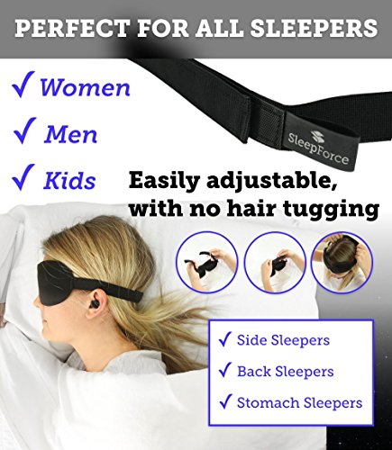 The SleepForce Sleep Mask is the highest quality, best rated, premium eye cover for sleeping available today. If you have issues falling asleep at night, while traveling by airplane or in cars this is the perfect blackout eye shades to make falling asleep easier and cure migraines. The contoured design with light as air memory foam and two fully adjustable straps make it the perfect fit for men, women, and kids alike. It's like having a blindfold on but without any of the discomfort!