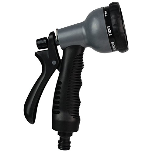 -. Feature : DURABLE: Heavy duty metal construction is much stronger than average plastic spray nozzle. No need to worry about breaking easily anymore / 8 WATERING PATTERNS: Garden nozzle in different types of watering: CONE, JET, CENTER, MIST, SHOWER, RINSE, FLAT, SOAKER Perfect for Car Washing, Garden/Lawn Watering, Room/Deck/Floor Cleaning, Pets Washing / EASY TO USE: Each mode of garden hose spray gun is clearly marked and easy to switch, just twist the front ring to the left or right till it clicks on each mode / ADUSTABLE WATER PRESSURE: Garden hose spray gun with a flow control knob allow you adjust the water pressure flexible at the 8 watering pattern and avoid a waste of water / COMFORTABLE: Soft rubber coating makes nozzle slip-resistance and grip the handle comfortable. Hand free clip is designed for long time spray