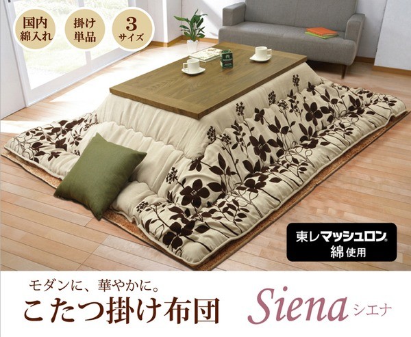 シンプルなリーフ柄をあしらった商品です。表地には肌触りやわらかなフランネルを使用しました。部分暖房のこたつは電気代もお得です。