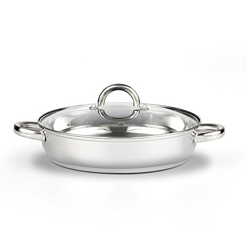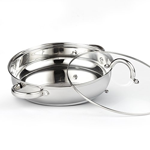 Cook N Home Stainless Steel Paella and Everyday Pan 4Qt/11-inch, Mirror-polished stainless steel body, Capsuled Aluminum disc in bottom for even heat distribution, Tempered glass lids for viewing food during cooking, Dishwasher safe, Induction stovetop compatible,1 Year Hassle Free Replacement warranty through Cook N Home.Feature