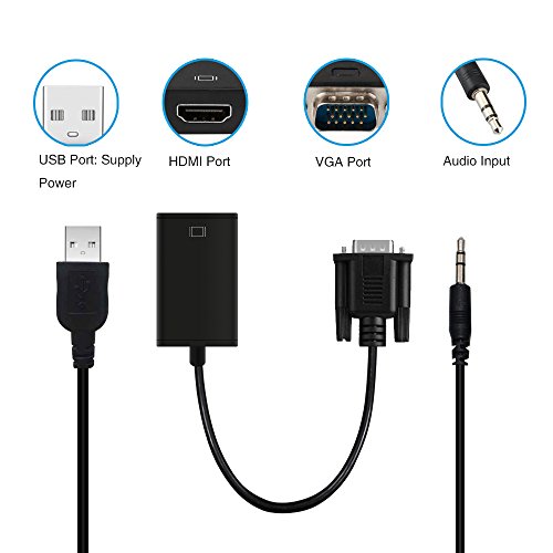 Specifications: -HDMI Video Input Formats: 480i / 576i / 480p / 576p / 720p / 1080i / 1080p -VGA Video Output Formats: 480i / 576i / 480p / 576p / 720p / 1080i / 1080p -Products for Audio Output: 3.5 Audio /3.5 TO R L -Product Input: HDMI -Product Output Terminal: VGA Audio -Micro USB cable for additional power supply -Plug and Play, no driver needed Color: Black