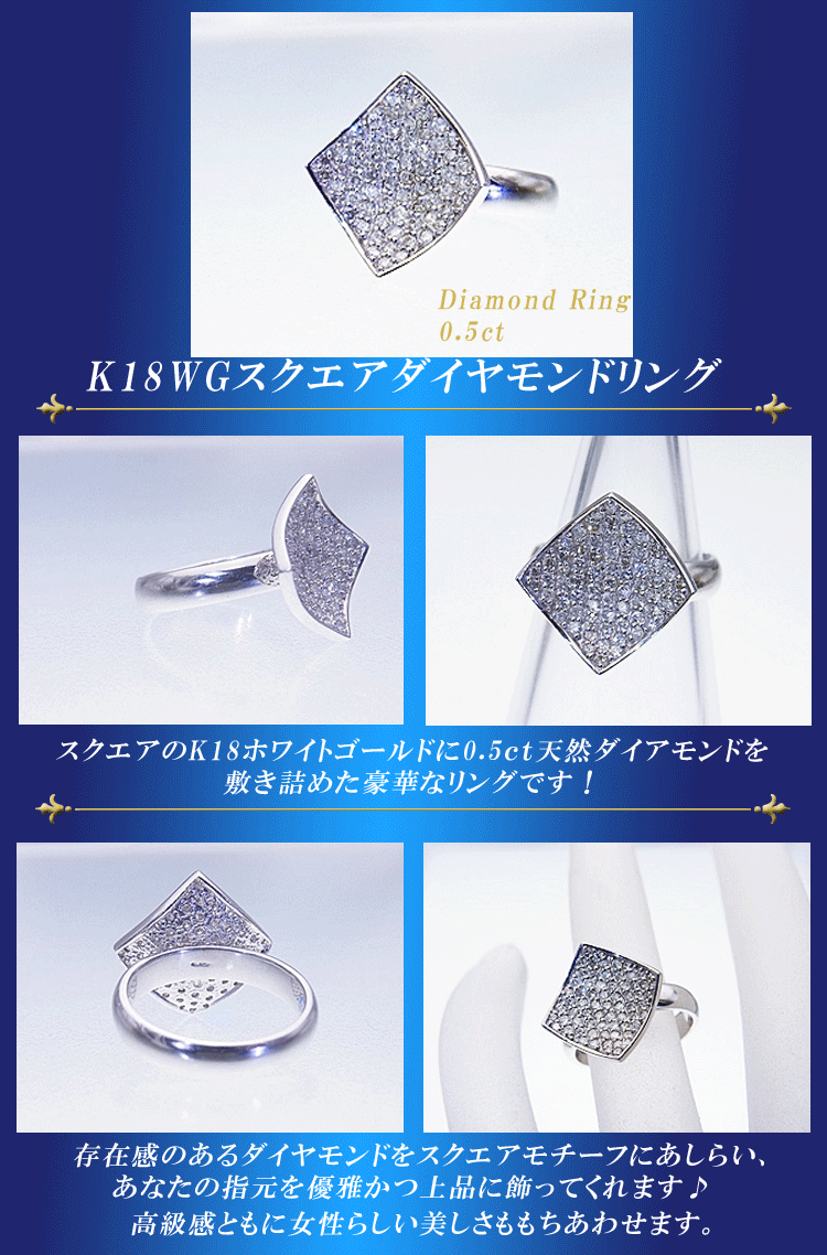 商品説明 スクエア枠にトータル0.5ct天然ダイヤモンドを散りばめたお洒落なK18ホワイトゴールドのリングです。