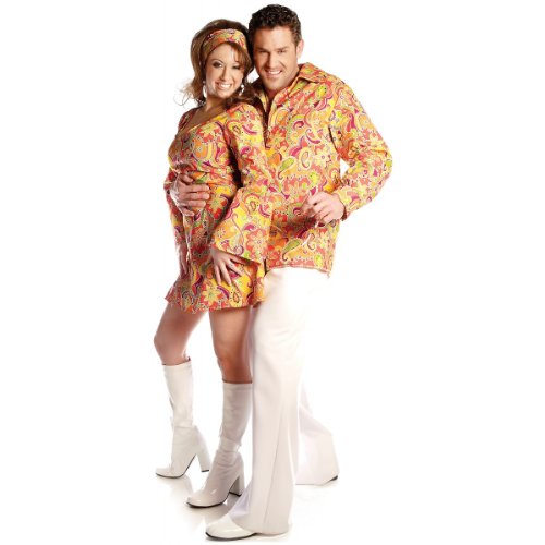 -. Brand : Spook Shop -. Color : Orange -. Department : womens -. Feature : Comes in four adult sizes\nA-line orange mini-dress with bell sleeves and head scarf / Groovy Baby! / Adult Sexy Go Go Costume - Orange -. ProductGroup : Apparel -. ProductTypeName : ADULT_COSTUME -. SKU : UW28948 -. Title : Sexy Go Go Costume - Orange
