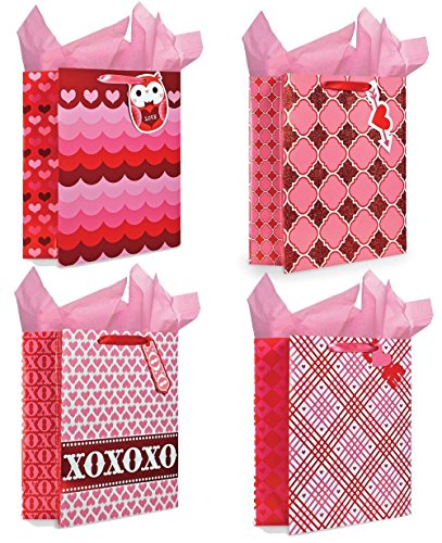 B-THERE Gift Bags with Tissue Paper Included XOXO Gift Bags, Great for Mothers Day or Valentines Day Glitter and Reflective Foil Designs, Large, Pink/Red, Set of 4