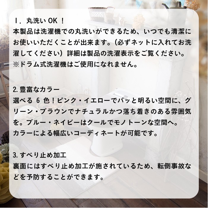 サイズ 約55×60cm 材質 パイル部/ポリエステル75%・アクリル25% 原産国 中国 使用上のご注意 マットの裏面にはすべり止め加工が施されているので、 塩化ビニール系の床材で長時間使用するとすべり止め加工の成分が反応し、 床材が変色することがあります。 目安として1週間ごとに使用場所を移動したり、 床面をふいたりしますと変色が防げます。 ホットカーペットや床暖房など暖房器具の上での使用は、 変色やすべり止めの成分が溶着するおそれがありますので絶対におやめください