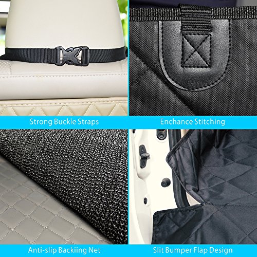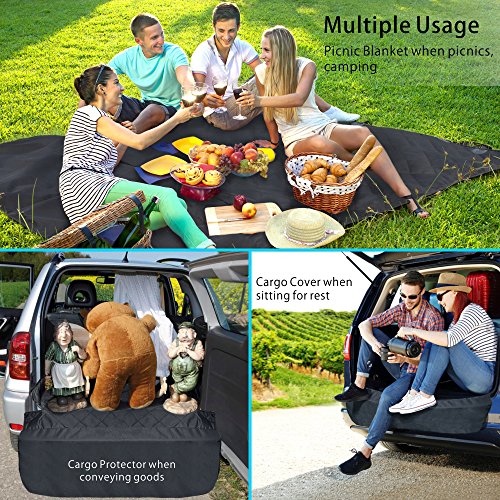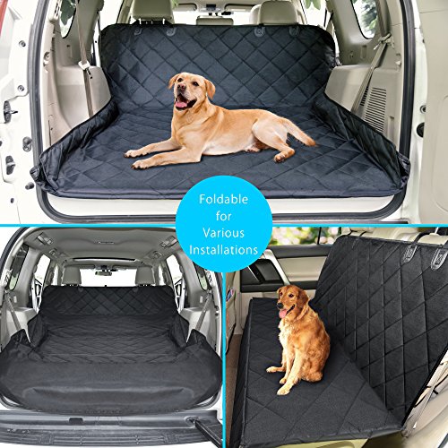 -. Feature : XL Size for Universal Fit: At extra-large size of 55 *91 inch, our cargo liner cover is designed for larger cars, trucks, van and full-size SUVs, also foldable to fit specific vehicles like sedan, minivan, station wagon, perfect for puppies, doggy, large and extra-large adult dogs and pets / Say Goodbye to Muddy P.R.Ints & Dander: This pet cargo cover with bumper flap protector, made of 4-layered reinforced wear-proof 100% Waterproof-coated Oxford fabric, protects your cargo area from dog or pets clawing damages, dander, fur, spills, mud and water while easy to clean by wiping, vacuuming or washing / Larger Non Slip & Slide Backing: 45*54 inch larger textured anti slip rubber backing net guarantees double stability, keep the pet seat cover stay in place firmly, no need worry that your pup or pets will be tossed back and forth when you're on the go! / Quick Install with Multiple Usage: Simply snap the adjustable buckle straps around your headrests and tuck in the seat anchors, super easy to install and remove; Our SUV cargo cover can be used as Car Cargo Protector, Pet Seat Cover or Picnic Blanket when outdoor picnic, travel / 100% Satisfied Pet Seat Cover : This dog seat cover for SUV comes with our worry free 12-month warranty and 24 hours prompt customer service, so if you are NOT satisfied with it for any reason, simply contact us, 100% REFUND or REPLACE