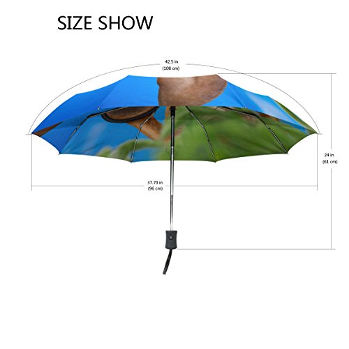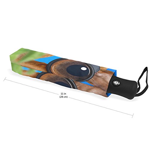 materials: made of 100% polyester pongee waterproof fabric. Weight: it is lightweight, 393g. Single-sided printing. Style: automatic open and close umbrella; foldable mini travel umbrella. Can be used on rainy and snowy day. Suitable for boys, girls, women and man. Feature: Light weight, small, portable. This Dachshund Or Sausage Dog Binoculars Glasses Blue Sky Behind Bushes folding umbrella is also a perfect Christmas gift, new year gift, and back to school gift. 0