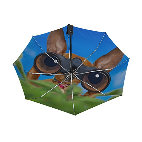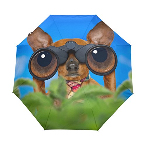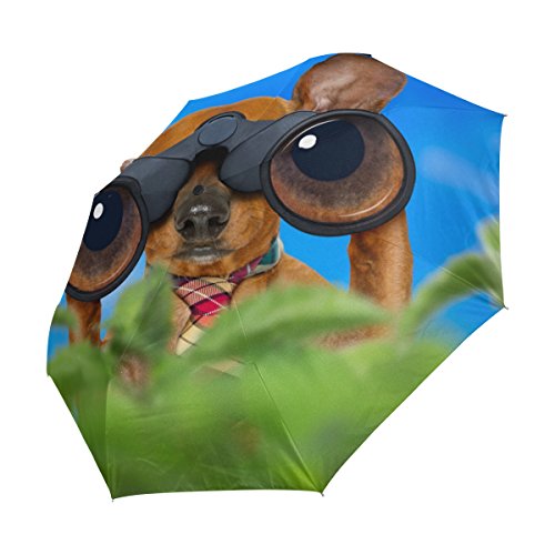 Studio : Naanle Publisher : Naanle Binding : Misc. Product Description Dachshund Or Sausage Dog Binoculars Glasses Blue Sky Behind Bushes Auto Foldable Umbrella is easy to open and close. You will expect the rainy day when you have this umbrella so that you can use it.