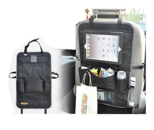 -. Feature : 36cm*58cm,9 pockets for iPad,bottles,phones,magzine umbrella and so on,large capatity,please pay attention that the biggest pocket is a solid black bag which can hang the ipad,not a touch screen tablet holder / Easy-view mesh pockets on the bottom can store smaller items,no need to find them anywhere anymore / Solid black color, not easy to get dirty / Go with 2 hooks which allow to hang something,but please kindly note it should not be too heavy / Foldable design, just take it out when dont need to use it, help to save your space