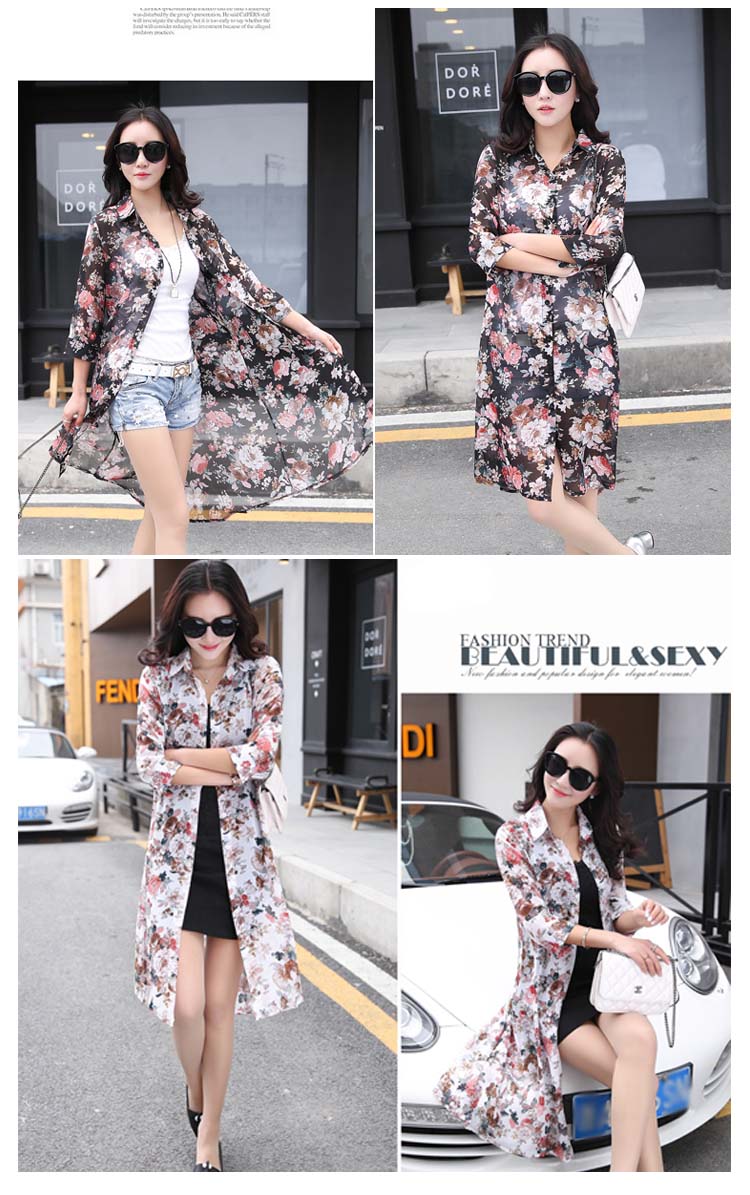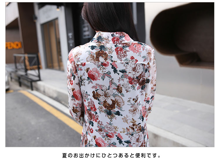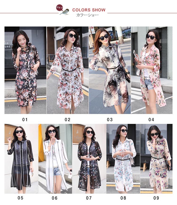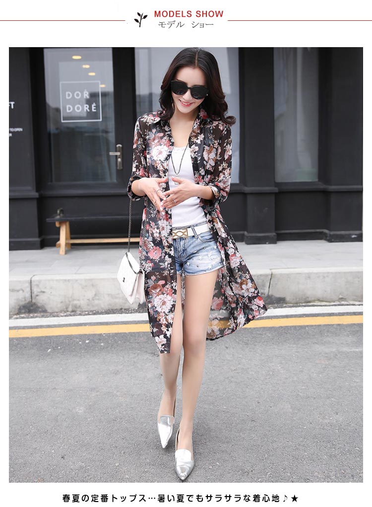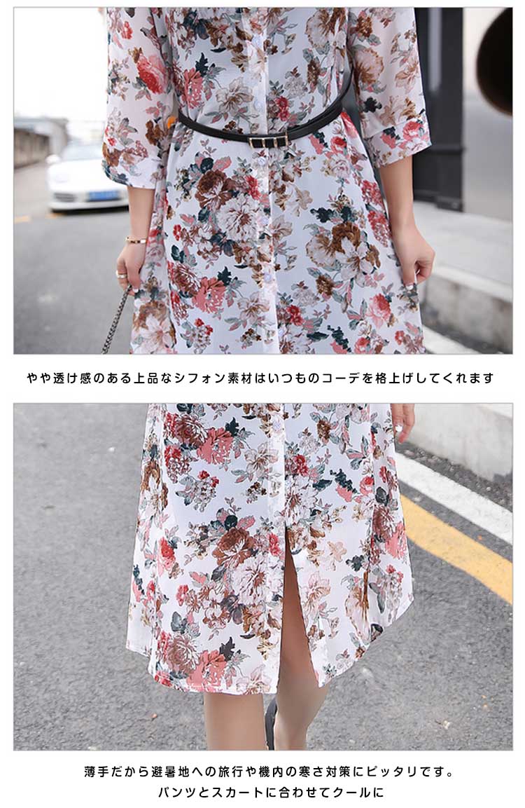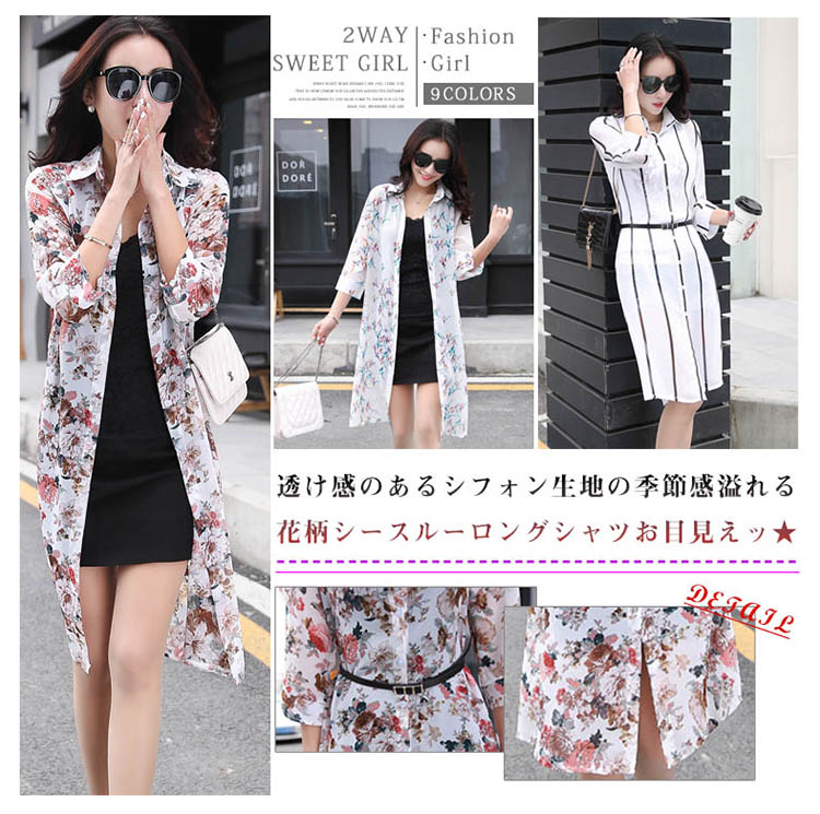 | 透け感のあるシフォン生地の季節感溢れる花柄シースルーロングシャツお目見えッ★春夏の定番トップス…暑い夏でもサラサラな着心地♪★ 透け感のあるシフォンだからインナー選びも楽しい♪程よい透け感が可愛さUP ! シンプルな中に個性的な雰囲気も演出します。 | |