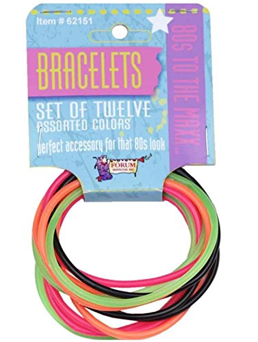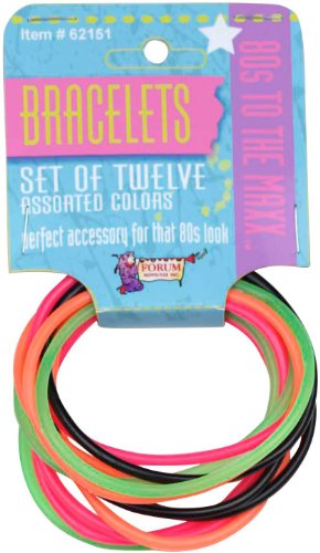 Perfect for any 80's New Wave costume! This 12 piece set includes three soft rubber bracelets each in hot pink, orange, lime, and black.