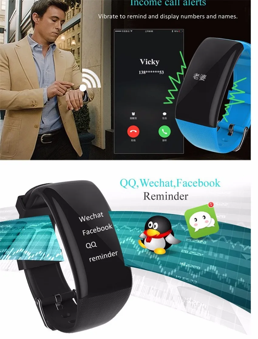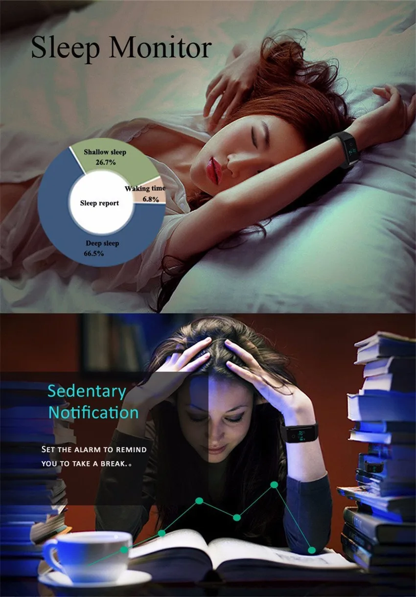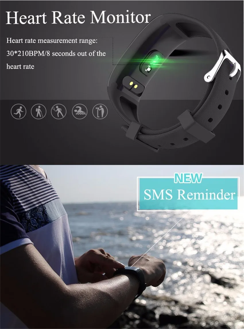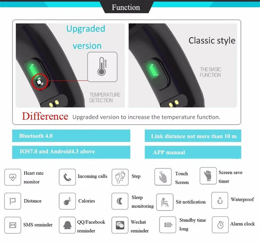 Function:Noctilucent,Alarm Clock,Push Message,Passometer,Thermometer,Message Reminder,Sleep Tracker,Heart Rate Tracker,Call Reminder,Fitness Tracker