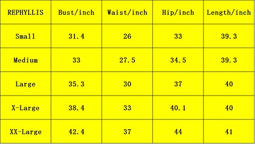 Size: S,M,L,XL,XXL S Bust/31.5(INCH) Waist/26.0(INCH) hips/34.6(INCH) length/39.4(INCH) M Bust/33.1(INCH) Waist/27.6(INCH) hips/34.6(INCH) length/39.4(INCH) L Bust/35.4(INCH) Waist/30.0(INCH) hips/37.0(INCH) length/40.2(INCH) XL Bust/38.6(INCH) Waist/33.1(INCH) hips/40.2(INCH) length/40.2(INCH) XXL Bust/41.7(INCH) Waist/37.0(INCH) hips/44.1(INCH) length/41.0(INCH)