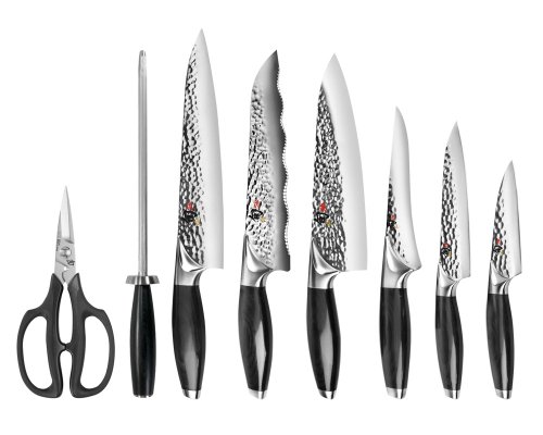- Feature : Shun Edo 9-Piece Knife Set includes 6 of our most popular Edo knives, a set of kitchen shears, honing steel and handsome horizontal bamboo block / Precision forged from one solid piece of VG10 "Super Steel" and "zero-balanced" allowing knives to do all the work / Hammered "tsuchime" finish creates air pockets for natural food-release, reducing knife drag / Resin-impregnated Pakkawood handles provide added strength and moisture protection; handle shape is comfortable and reduces hand fatigue / Knives are hand-crafted featuring ultra-sharp 16 degree cutting edges; widened bolster shape encourages proper grip and reduces forearm fatigue