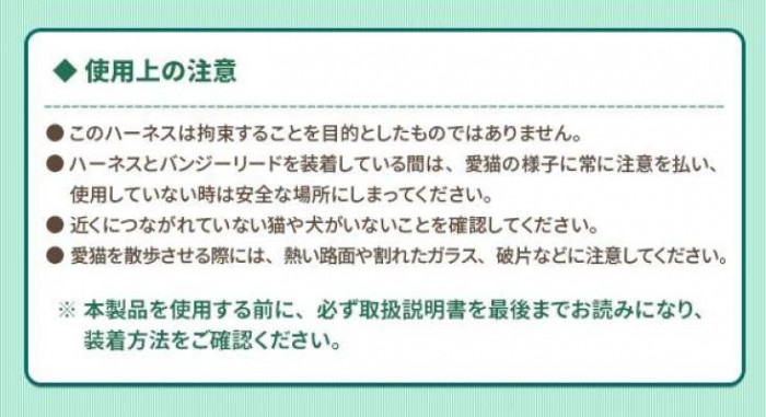 動きやすさと安全を考えた、ハーネスとバンジーリードのセットです。愛猫の喉を締め付けず、安全に、かつ抜け出すことがないようにぴったりフィットさせることができます。ワンタッチバックルでハーネスの着脱も簡単。バンジーリードの長さは約1mで、リード部分が伸び縮みするので、動きやすく快適に装着いただけます。胴回りが約23~28cmのネコちゃん用。 |