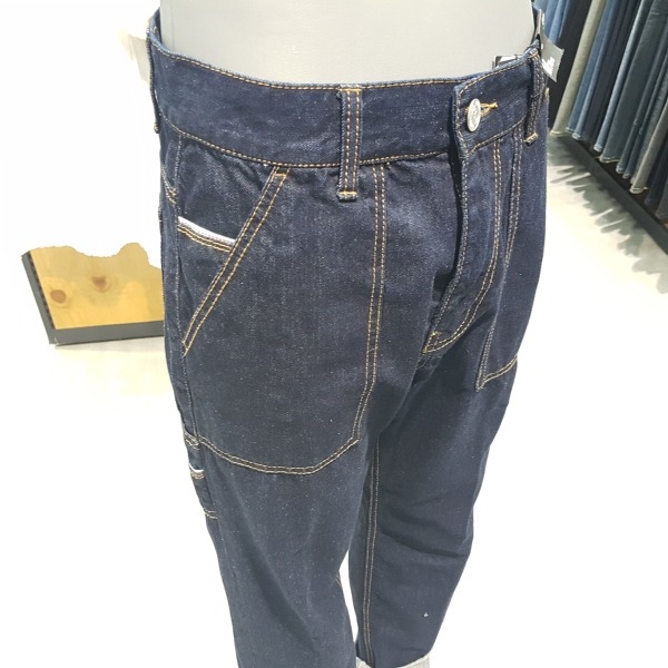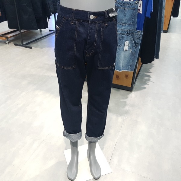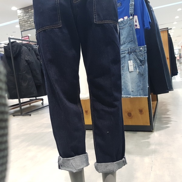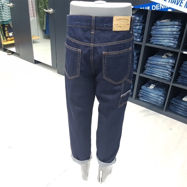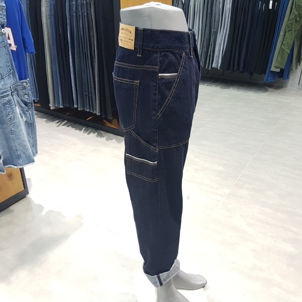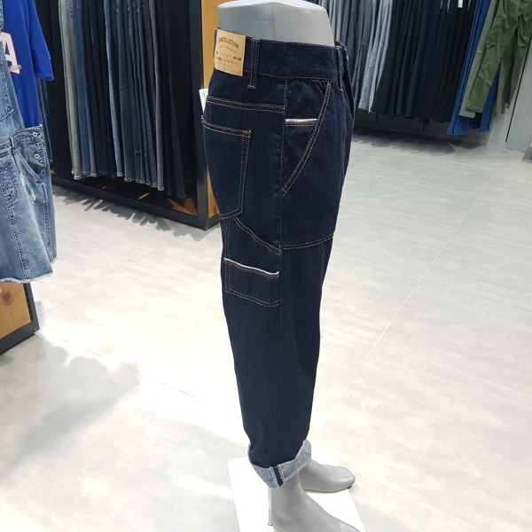 인디고 로우 루즈 테이퍼드.허리선을 올려 밑위가 긴게 특징.아웃포켓이 있는 워크웨어 디테일로 보통은 롤업해서 입었을때 느낌이 잘 살고 멋스러움.