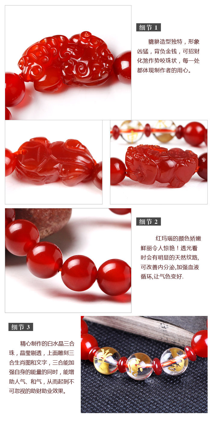 | ?Product introduction: Three?is a kind of?"Ming",?work in just ways.?Is the three?Zodiac?with kyrgyzstan.?Thus,?the 12 earthly branches,?a total of four groups with kyrgyzstan. Shen Zichen,?three?…....?monkey,?rat,?dragon,?three in one?group?with kyrgyzstan. Have?you?ugly,?three?…....?snake,?is a chicken,?ox,?three in one?groupwith kyrgyzstan. Yin?Wu?Xu,?three?…....?tiger,?horse,?dog,?three in one?group?with kyrgyzstan. Hai?Mao?did not,?three?…....?pig,?rabbit,?sheep,?three in one?group?with kyrgyzstan. And?three,?combination,?not only fit good,?ideas,?values,?habits,?action...That?is so?agree in opinion.?Three?animals of the Chinese zodiac?is four years,?is?a heaven-made match.?This bracelet?is a?feng shui masteraccording to Zhou Yisan?rich?Bureau?principle design?and?synthesis ofconsecration.?With?three?water?bureau,?strengthen its?energy at the same time,?can increase the?popularity,?and?can not be ignored,?thus?tohelp?finance?to help the industry?effect on?the?zodiac?people;?for?more physically frail?people wearing the?bracelet?can?enhance their?energy?onSanqi?evil?evil?effect;?the?property?is poor?or?treasury.?Impaired,?can enhance the?wealth,?fill the?Treasury;?for the?poor?are often?excludedthat?interpersonal,?out on a limb,?wearing the?Sanqi?bracelet?canenhance popularity,?improve its?magnetic field.?Three peculiarnumerology?effect,?called?qi! The nine sons of the dragon?dance is?the ninth son,?there are evil spiritsaway evil,?the home's power.?There is no ass mouth,?swallowing all things without diarrhea.?For?eight party?property,?can be treasure,?not only into,specific magical powers.?Chuan?brave?because?the,?the Jade Emperor?sent?his?only eat?not to?pull.?So?brave is money for food,?food intake?fortune Quartet,?the stomach is a?moss?capsule,?also?urgedofficials.?Brave is fierce auspicious,?and retaining the main heart strong.The role of?a?talisman.?Brave role in Feng Shui,?can be divided into the following?several points: A,?a?talisman?role.?The?Pixiu?placed in the home,?the?home?run well,?good luck to strengthen,?drive away evil,?have?a great?effect,?become the patron saint of home,?the?family's safety. Two,?CAI has the role of fiscal trend.?This is?a lot of people?know,?in some?gambling house?sparrow?Pavilion,?are very?easy to see?the brave.In addition to partial financial aid,?help?is wealth,?it is also a businessmanPixiu placed in the office?or home. Three,?Huang defuse the role of exorcism,?yellow?is terrible?killer,?in Feng Shui?it went,?makes the?house of?population?health,?not?transport lagetc.,?have already been?described in detail,?Pixiu placed in?Wuhuangwherever?we?can solve?the?fierce,?if the?door?is best placed?to. The brave?or?many functions,?but?this auspicious?is best used to?turn down town home?and?income,?especially in?fortune,?brave is?obviouseffect. Agate?is?widely used?since ancient times,?ancient?people often use?"Pearl agate" to describe the?wealth;?many foreign?legend tells of?agate?can give?the wearer to?bring happiness and confidence,?bring?dreams. Efficacy:?the longevity of the?stone,?promote?happiness and wealtheffect,?can bring?good luck,?help to ease the?pressure,?strengthen thebravery?and courage,?get rid of?bad luck.?Black Onyx can eliminate fear,make people have a sense of security.?Can ward off evil?and to prevent the?intrusion of the?negative energy,?can also be black magic and?evilcurse and so?full?of all?the negative energy?rebound?back to the originalsender,?home,?business protection stones.?May increase the people?to see the big,?especially in?the future,?will not be?lost?and target,?and?make people in?oneself place?without losing?position.?Black Agate?withprojected?energy?strong,?the?black?action besides?can absorb?the negative energy,?also?because of its?smooth?surface?and the?negative energy is?reflected back,?so?as?to?say?powerful?enchantment. Onyx spiritual role: 1?agate is one of Buddhist Shippo,?since ancient times has been?astalismans,?amulets,?symbol of the friendly affection and hope,?help to eliminate?stress,?fatigue,?decoration and other negative energy. 2 the amount of?agate placed in under the pillow,?help secure sleep,?and bring good night. 3?for some of the agate?crystal to degaussing charging,?such as?ring,pendant,?earring,?bracelet?and so on,?but please?use paper or cloth to live,?so as not to?scrape. 4?in the West in the magic,?teach their desire to write?on a piece of paper,?folding well,?after meditation,?and then into the?agate?cornucopia,at least a day night,?let the energy?machine reinforcement,?in whichremoved,?will be cremated burned,?with the help of fire power,?will?youwish?to?nature,?can come. 5?read the children?contact the?agate,?agate?characteristics can beinfected,?smart,?flexible and clever,?strong learning ability,?good adaptability. 6?wearing?agate,?can strengthen the affinity,?can be?flexible,?be all things to all men,?help business growth,?strong financial resources. |