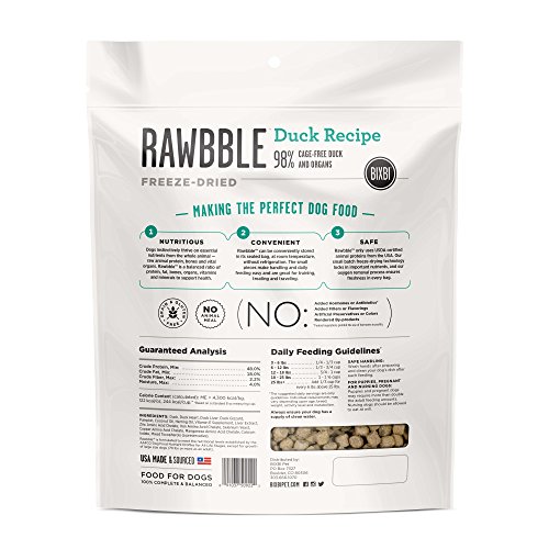 There is a subtle, but important difference for Bixbi between "dog food" and "food for dogs." One is adequate. One is exceptional. Bixbi chooses exceptional. RawbbleTM blends quality, nutrition and convenience in a way not previously seen in a complete and balanced food for dogs. NUTRITIOUS -- Dogs instinctively thrive on essential nutrients from the whole animal; raw animal protein, bones and vital organs. RawbbleTM is a balanced ratio of protein, fat, bones, organs, vitamins and minerals to support health. CONVENIENT -- RawbbleTM can be conveniently stored in its sealed bag, at room temperature, without refrigeration. The small pieces make handling and daily feeding easy and are great for training, treating and traveling. SAFE -- RawbbleTM only uses USDA certified animal proteins from the USA. Bixbi's small batch freeze-drying technology locks in important nutrients, and their oxygen removal process ensures freshness in every bag, Raw Nutrition + Kibble Convenience. Just 2oz of RawbbleTM is equal to 8oz of conventional dog food.Feature