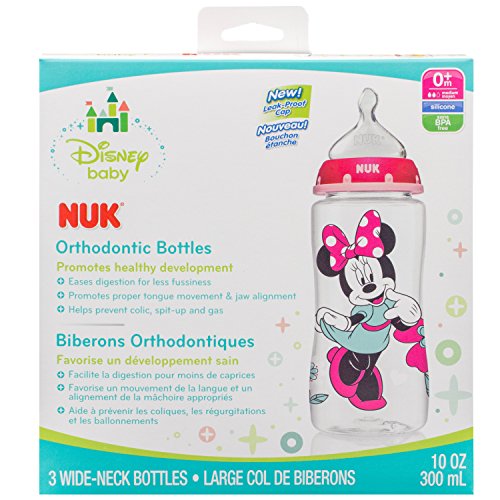 NUK bottles now feature improved Perfect Fit nipple, which provide a natural way to bottle feed your growing baby. The Perfect Fit unique nipple shape is inspired by Mom as Mom's nipple changes shape during breastfeeding and it's the same shape as the NUK Perfect Fit nipple. 9 out of 10 Babies Accept the improved Perfect Fit nipple, based on research among 200 NUK users. It provides the perfect fit in baby's mouth just like Mom, so you know that your baby will love these NUK bottles. Perfect Fit nipples feature Soft Zone and Anti-Colic Air System that helps reduce colic, gas and spit-up. 1-piece vent is integrated into the nipple so there are no extra parts to clean. Soft Zone provides greater comfort as soft satiny finish conforms to baby's palate. Perfect Fit nipples are optimally sized to support baby's growing mouth and appetite, available in 2 nipple sizes and 3 flow rates. The wide bottles are easy to use, clean, and assemble and are dishwasher safe. For best results when feeding, make sure that the NUK Anti-Colic Air System symbol is under baby’s nose so that the unique drinking hole on top side is positioned correctly. NUK bottles are BPA Free and come with slow flow silicone nipples. Available in an adorable Minnie Mouse design.Feature