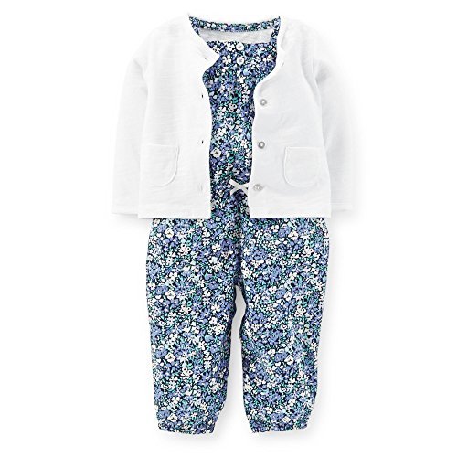 -. Binding : Apparel -. Brand : Carter's -. Color : Blue -. Department : baby-girls -. Feature : Set includes poplin floral romper and button-front cardigan / Nickel-free snaps on reinforced panel last through all those changes / Cinched waist and flutter sleeves are a girly touch -. ProductGroup : Apparel -. ProductTypeName : SHIRT -. Title : Carter's Baby Girls' 2-Piece Romper & Cardigan Set -Blue Floral