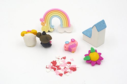 - ACCESSORIES: the cutie bear figurine, is about 2 cm High. The set also includes a 3cm x 5cm rainbow, flower with Ladybug 2.5cm x 2.5 cm, a church 3.5cm x 3cm and a car 1.5 cm x 2 cm