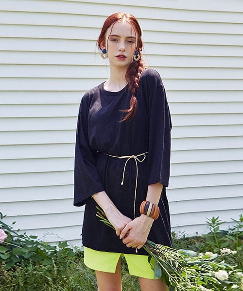 얀13(YAN13) 오버 슬럽 3/4 티셔츠+벨트 세트_블랙
