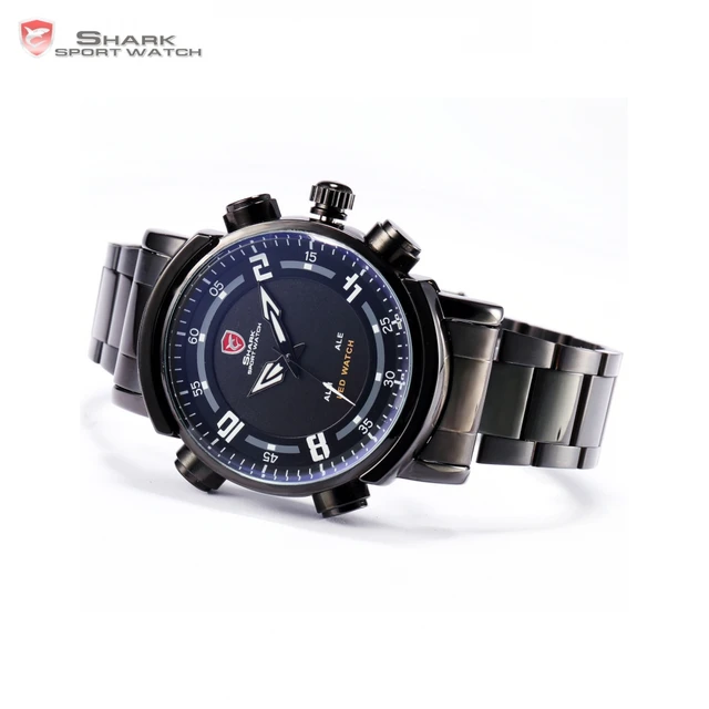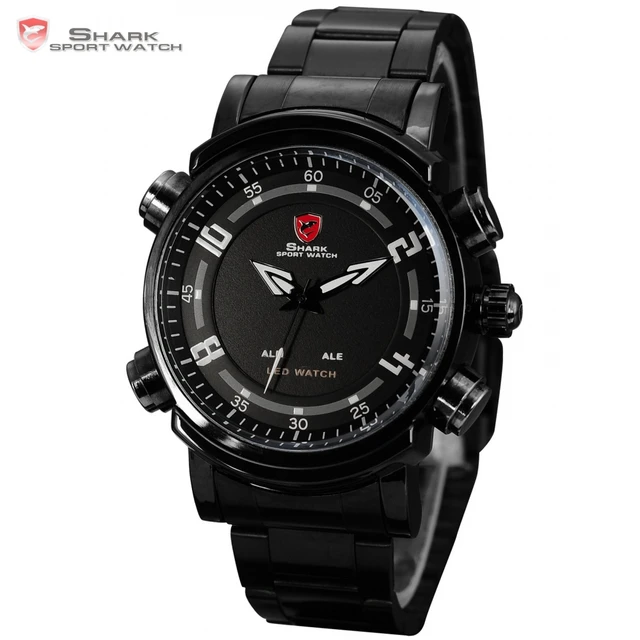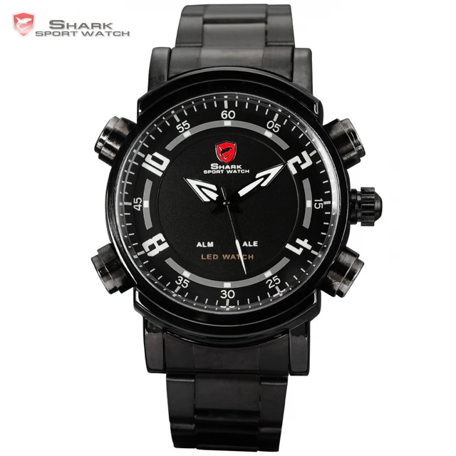 | [해외] Basking shark 스포츠 시계 led 아날로그 듀얼 타임 날짜 알람 블랙 스테인레스 스틸 밴드 남성 스포츠 디지털 석영 시계/SH064 |
