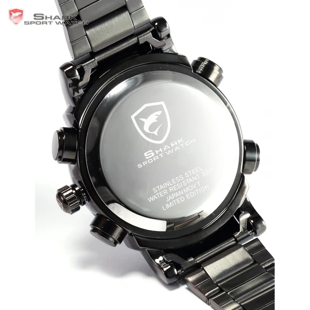 Basking 상어 스포츠 시계 LED 아날로그 듀얼 타임 날짜 알람 블랙 스테인레스 스틸 밴드 남성 스포츠 디지털 석영 시계/SH064 포장 상세