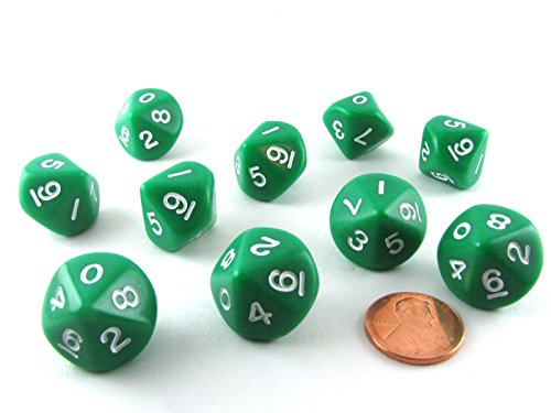 -. Title : 10 Piece Set of 10-Sided D10 Polyhedral Dice - Green with White Numbers
