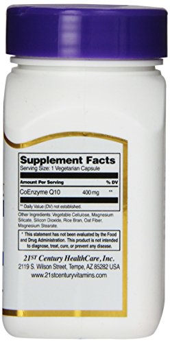 -. Binding : Health and Beauty -. Brand : 21st Century -. EAN : 0740985228227 -. Feature : CoEnzyme Q10 is a naturally occurring biochemical found in muscle tissues where a constant supply of energy is critical. / Supplement with CoQ10 to support the health of all body organs. / Support cardiovascular health and energy. -. IsAdultProduct : 0 -. Label : 21st Century -. Manufacturer : 21st Century -. Model : 22822 -. MPN : 22822 -. NumberOfItems : 1 -. PackageQuantity : 1 -. PartNumber : 22822 -. ProductGroup : Health and Beauty -. ProductTypeName : HEALTH_PERSONAL_CARE -. PublicationDate : 2011-01-21 -. Publisher : 21st Century -. Size : 30 Count -. Studio : 21st Century -. Title : 21st Century Co Q10 400 mg Veg Capsules, 30 Count -. UPC : 740985228227