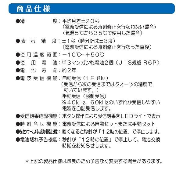 | 付属品 | 単3マンガン乾電池×2個、木ねじ(木の厚い壁・木の柱専用)×1本、石膏ボード用掛具(掛金具×1個・釘×5本)、取扱説明書、保証書(保証期間:1年間) |